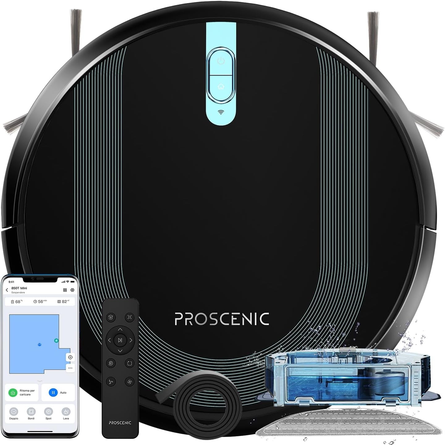 | Proscenic 850T Robot Aspirapolvere Lavapavimenti, Aspirazione Potenza 3000Pa Controllo Siri & IFTTT & APP & Alexa, Serbatoio Acqua Elettrico 2-In-1 per Pulizia Domestica/Capelli/Polvere/Lavapavimenti | 149.07 | 22.3605 | |